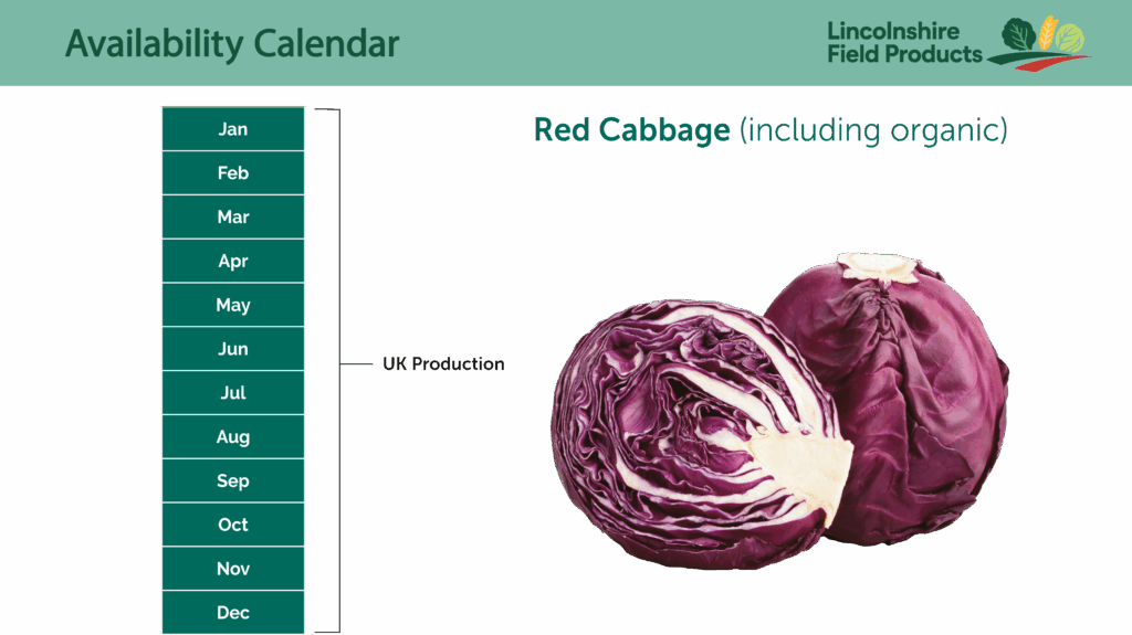 Our red cabbage is grown in the rich, fertile soils of South Lincolnshire, delivering vibrant colour, robust texture, and a sweet, earthy flavour. With its deep reddy purple leaves and excellent crunch, red cabbage is perfect for salads, pickling, braising, or adding a colourful twist to traditional dishes. Naturally rich in antioxidants, vitamin C, and fibre, it’s a healthy and eye-catching addition to any plate. Carefully harvested and supplied with full traceability, our red cabbage is available 52 weeks of the year and offers consistency, freshness, and standout visual appeal.